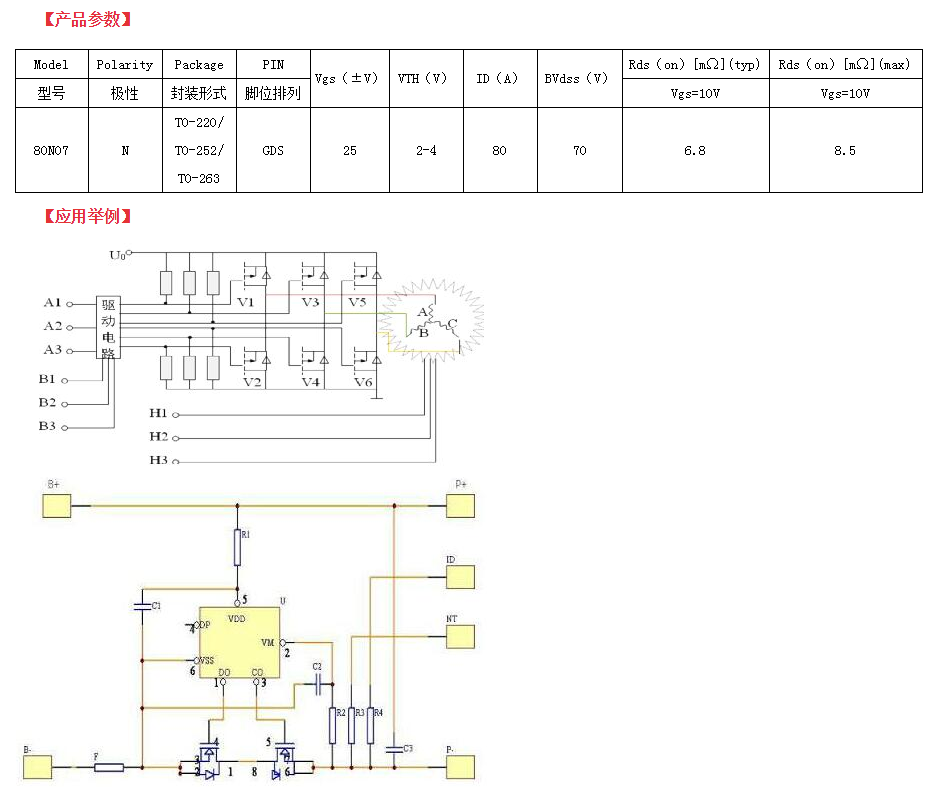 在80A、70V的大電流、低壓MOS管型中,推薦這一款純國產(chǎn)的80N07型號來應(yīng)用于電動車行業(yè)中的控制器跟鋰電池保護板的電路中。