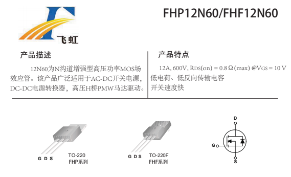 FHP12N60的主要封裝形式是TO-220、TO-220F,腳位排列位GDS。這款12N60場效應管產品具體參數:Vgs(±V):30;VTH(V):2-4;ID(A):12;BVdss(V):600。RDS (on) = 0。8mΩ(typ)@V GS =10V,低電荷、低反向傳輸電容開關速度快。
