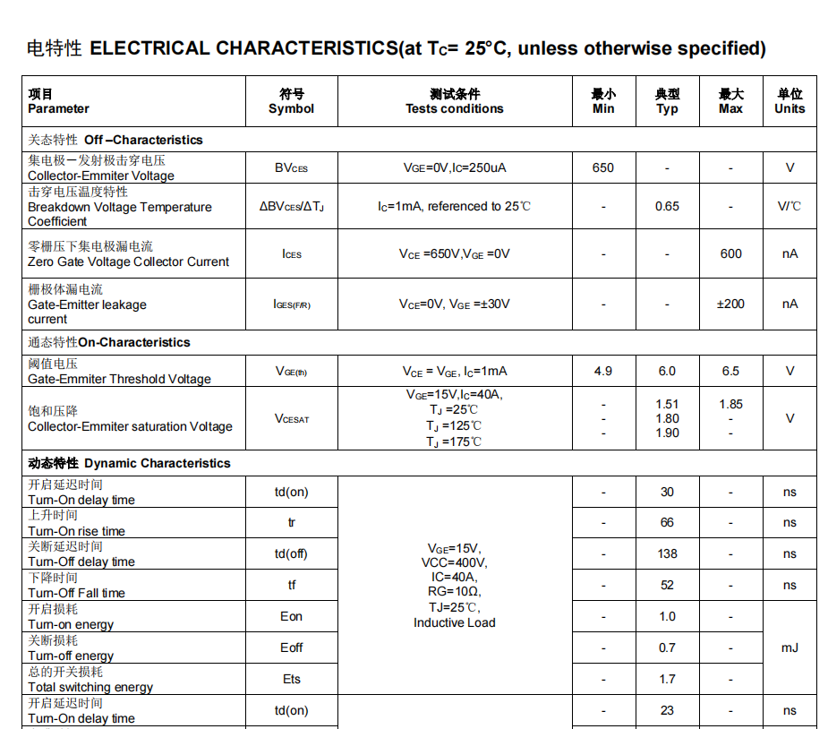FHA40T65A是一款場N溝道溝槽柵截止型IGBT,UPS高頻逆變電路IGBT代換,FGH40N60SFD型號參數使用Trench Field stop Ⅱ technology 和通過優化工藝,來獲得極低的 VCEsat 飽和壓降,并在導通損耗和關斷損耗(Eoff)之間做出來良好的權衡。